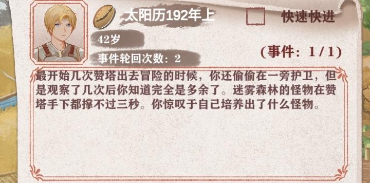 · 最开始几次赞塔出去冒险的时候,你还偷偷在一旁护卫,但是观察了几次后你知道完全是多余了。迷雾森林的怪物在赞塔手下都撑不过三秒。你惊叹于自己培养出了什么怪物。