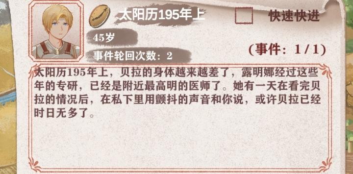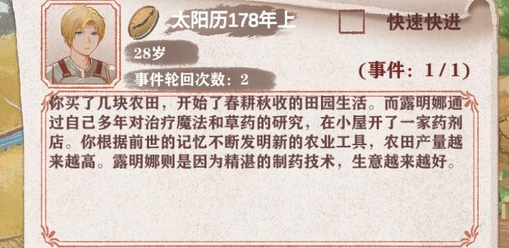 · 你买了几块农田,开始了春耕秋收的田园生活。而露明娜通过自己多年对治疗魔法和草药的研究,在小屋开了一家药剂店。你根据前世的记忆不断发明新的农业工具,农田产量越来越高。露明娜则是因为精湛的制药技术,生意越来越好。