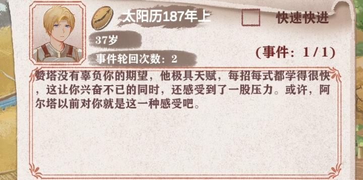 · 赞塔没有辜负你的期望,他极具天赋,每招每式都学得很快,这让你兴奋不已的同时,还感受到了一股压力。或许,阿尔塔以前对你就是这一种感受吧。