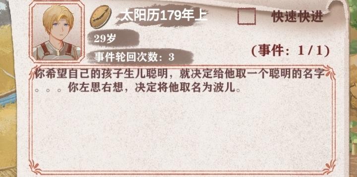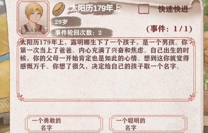 · 露明娜生下了一个孩子,是一个男孩。你第一次当上了爸爸。内心充满了兴奋和焦虑。自己出生的时候,你的父母一开始肯定也是如此的心情。想到这你就觉得感慨万千。你想了很久,决定给自己的孩子取一个名字。