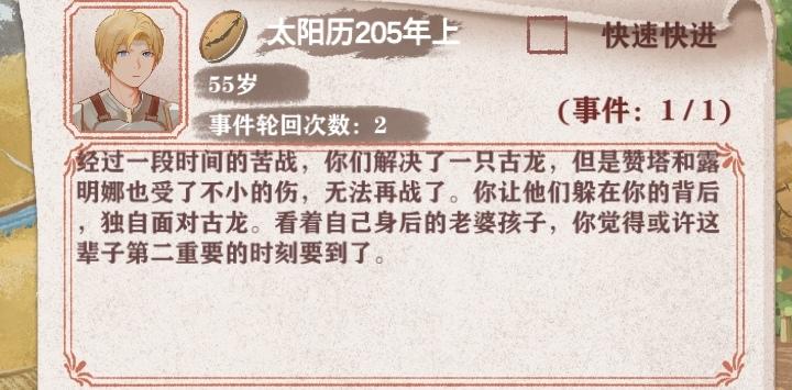 · 经过一段时间的苦战,你们解决了一只古龙,但是赞塔和露明娜也受了不小的伤,无法再战了。你让他们躲在你的背后,独自面对古龙。看着自己身后的老婆孩子,你觉得或许这辈子第二重要的时刻要到了。