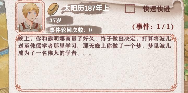 · 晚上,你和露明娜商量了好久,终于做出决定,打算将波儿送至侏儒学者那里学习。那天晚上你做了一个梦,梦见波儿成为了一名伟大的学者。
