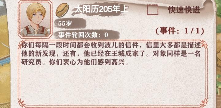 · 你们每隔一段时间都会收到波儿的信件,信里大多都是描述他的新发现,还有,他已经在王城成家了。对象同样是一名研究员。你们衷心为他们感到高兴。