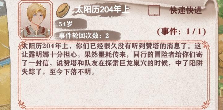 · 你们已经很久没有听到赞塔的消息了。这让露明娜十分担心。果然噩耗传来,同行的冒险者给你们寄了一封信,说赞塔和队友在探索巨龙巢穴的时候,中了陷阱失踪了,至今下落不明。