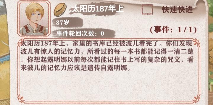 · 家里的书库已经被波儿看完了。你们发现波儿有惊人的记忆力,所看过的每一本书都能记得一清二楚。你想起露明娜以前每次都能记住书上写的复杂的咒文,看来波儿的记忆力应该是遗传自露明娜。