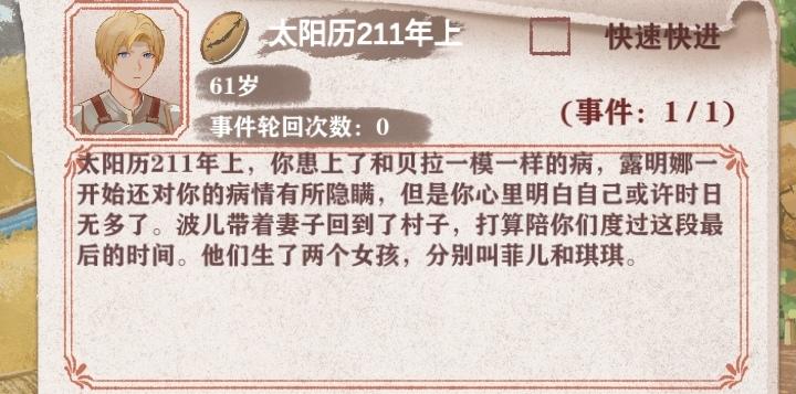 · 你患上了和贝拉一模一样的病,露明娜一开始还对你的病情有所隐瞒,但是你心里明白自己或许时日无多了。波儿带着妻子回到了村子,打算陪你们度过这段最后的时间。他们生了两个女孩,分别叫菲儿和琪琪。