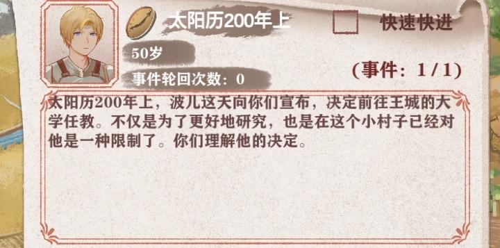 · 波儿这天向你们宣布,决定前往王城的大学任教。不仅是为了更好地研究,也是因为在这个小村子已经对他是一种限制了。你们理解他的决定。