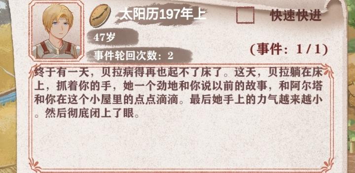 · 终于有一天,贝拉病得再也起不了床了。这天,贝拉躺在床上,抓着你的手,她一个劲地和你说以前的故事,和阿尔塔和你在这个小屋里的点点滴滴。最后她手上的力气越来越小,然后彻底闭上了眼。