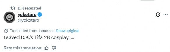 这张美图也引起了《尼尔》系列制作人横尾太郎的注意,他在社交媒体上进行转发,并表示:“蒂法的2B装扮我已经保存了。”