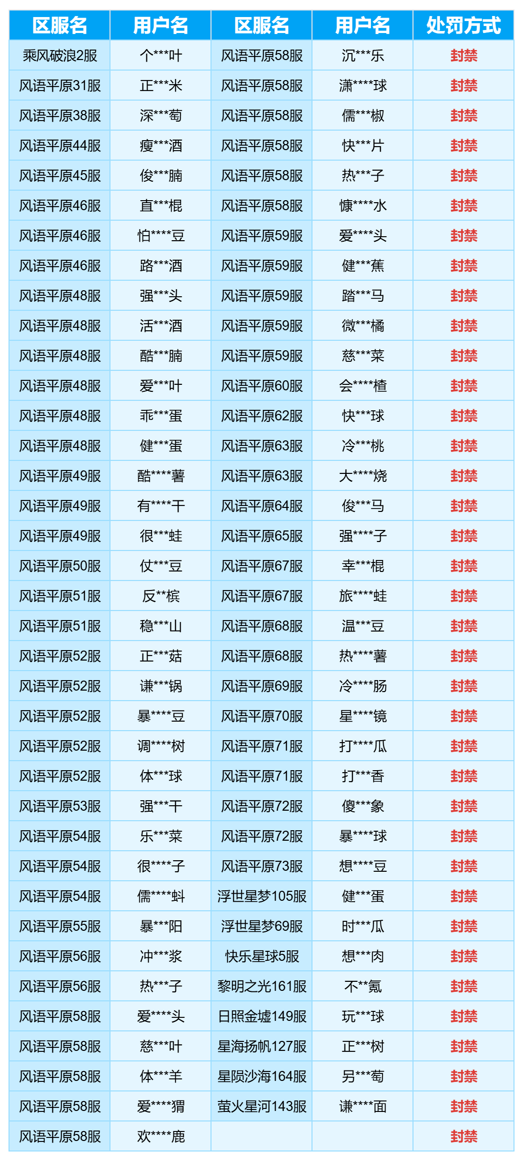11月20日12:01至11月27日12:00期间,封禁名单公示: