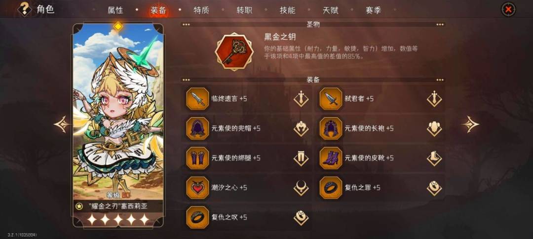 装备:圣徒(漩涡宝箱掉落,非抽取),扛不住换太阳骑兵,双减戒指,能量项链
