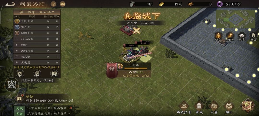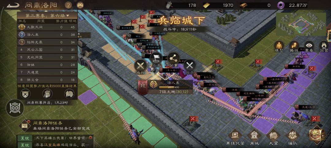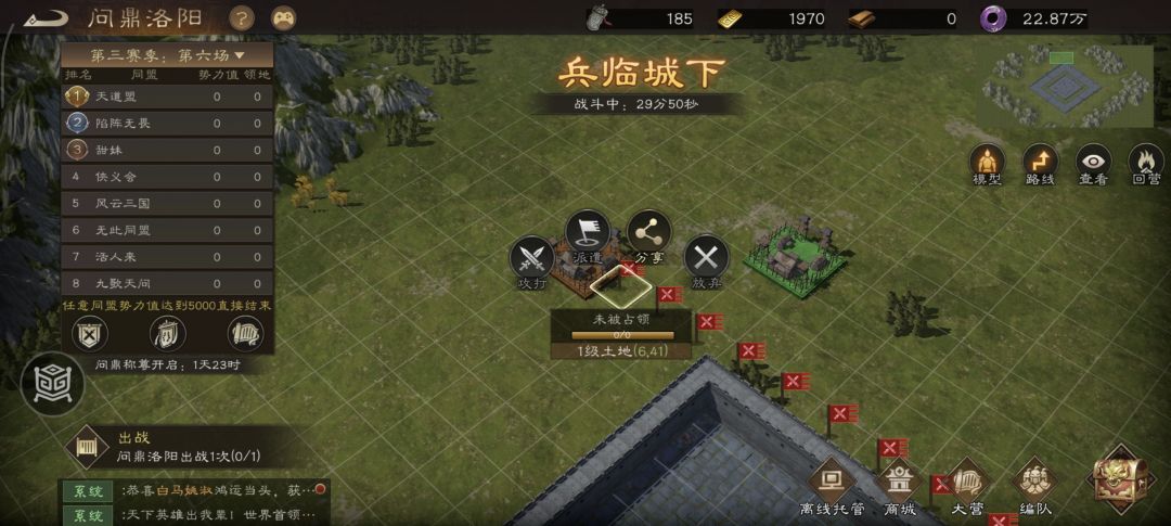 终于在第21分钟!我军与活人来在下路的7级土地进行了第一次正面战争!最终以我军碾压的实力占领了该7级土地