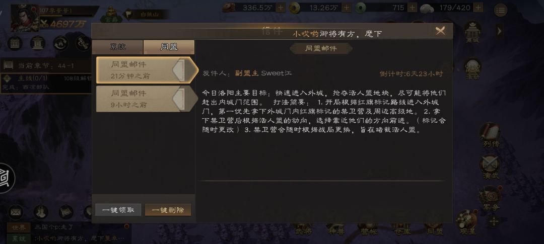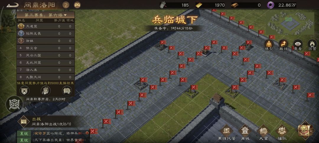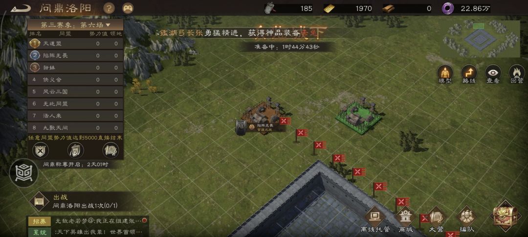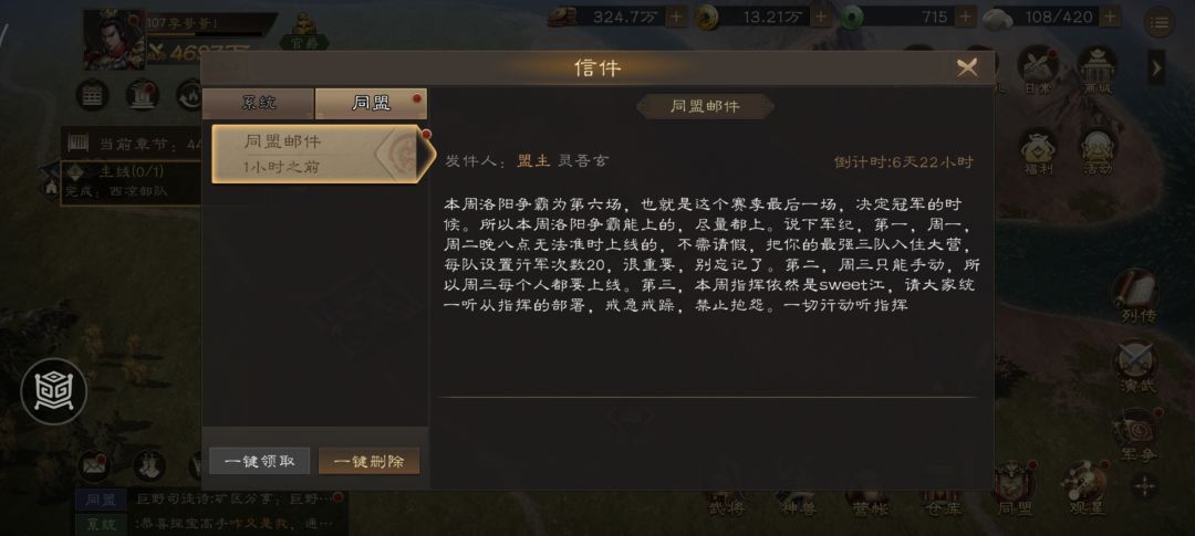 盟主今日早早得发布了本周的战略目标!本周是赛季最后一场!我们的目标是第一第一第一!同时安排了本周的任务要求!周一周二不在线就派遣,周三务必参加!