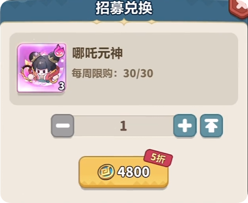 兑换商店每周有3次五折,4800买一次,一次给三个哪吒碎片。