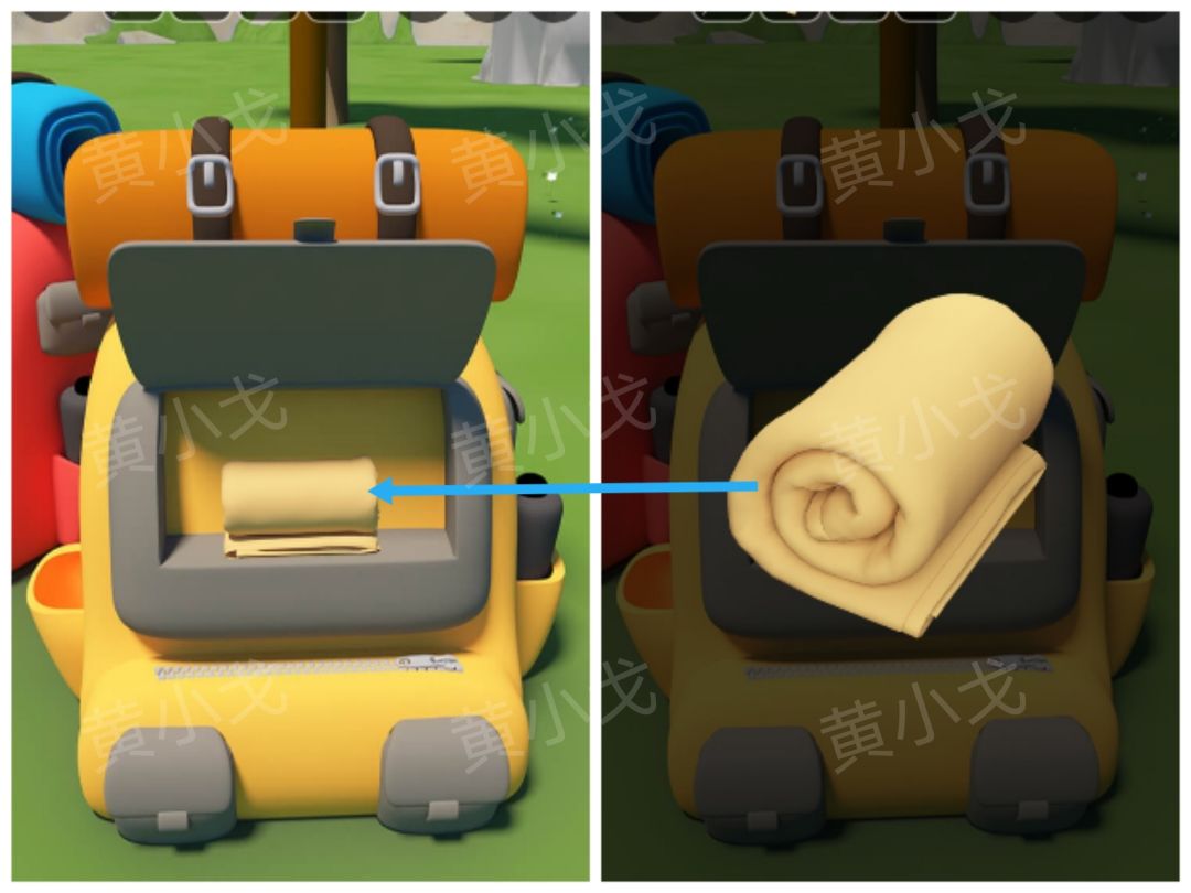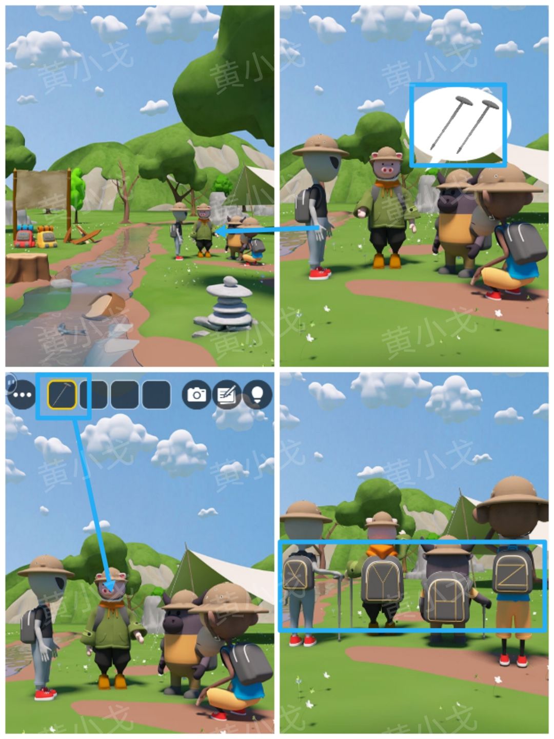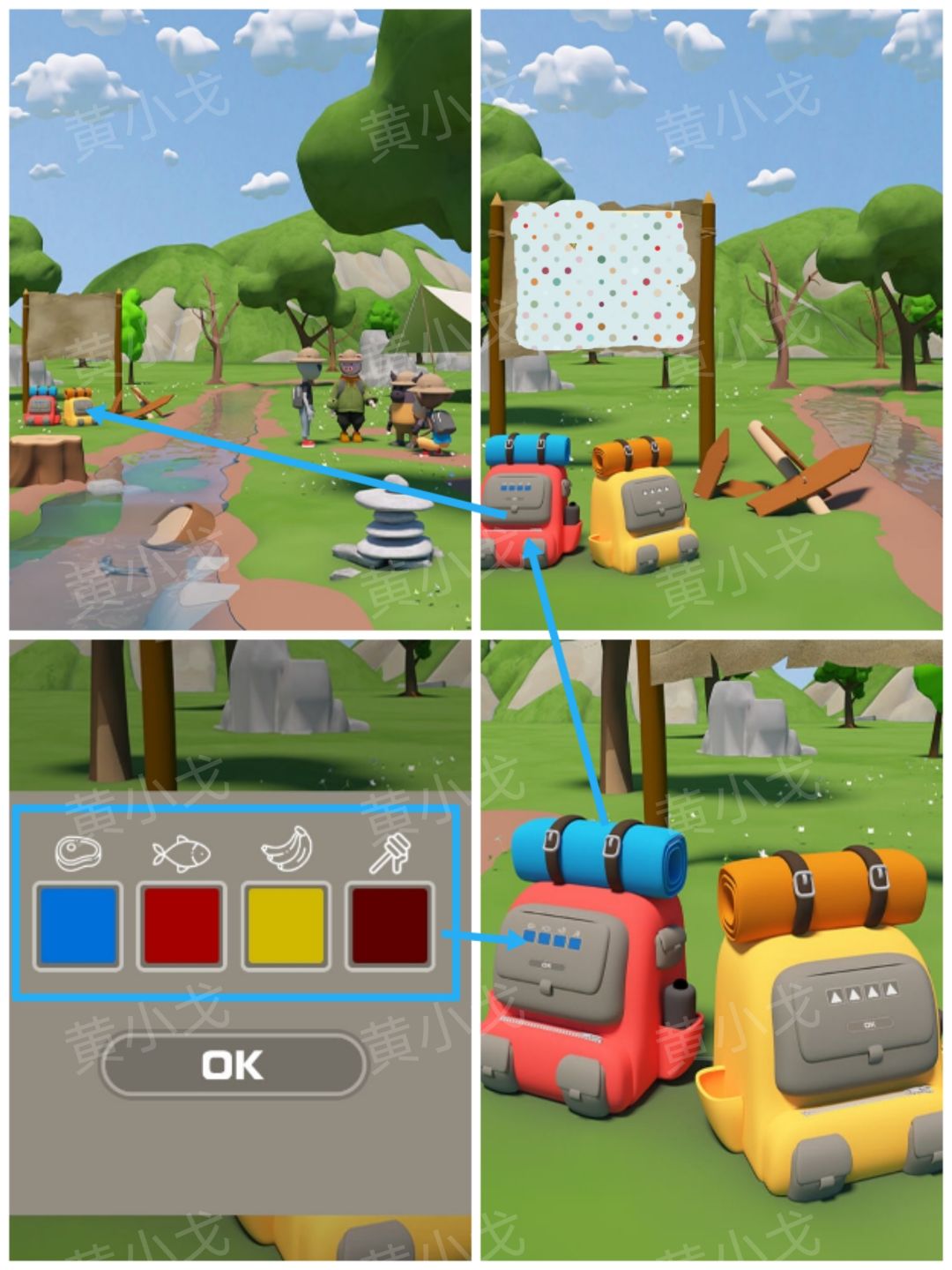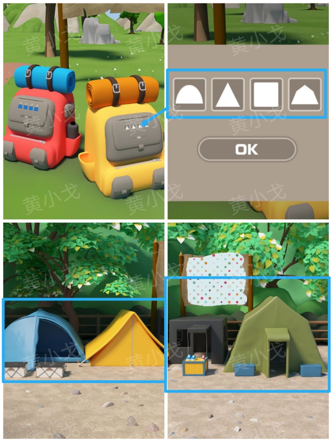 9.点击黄色背包上的密码锁,根据[帐篷]场景帐篷的形状,调整密码锁