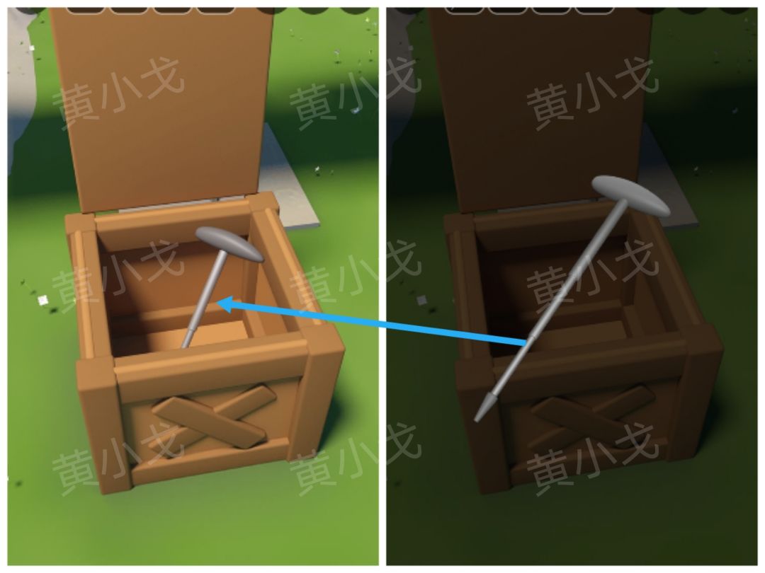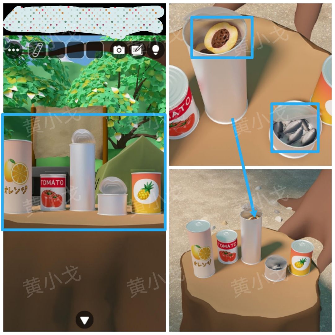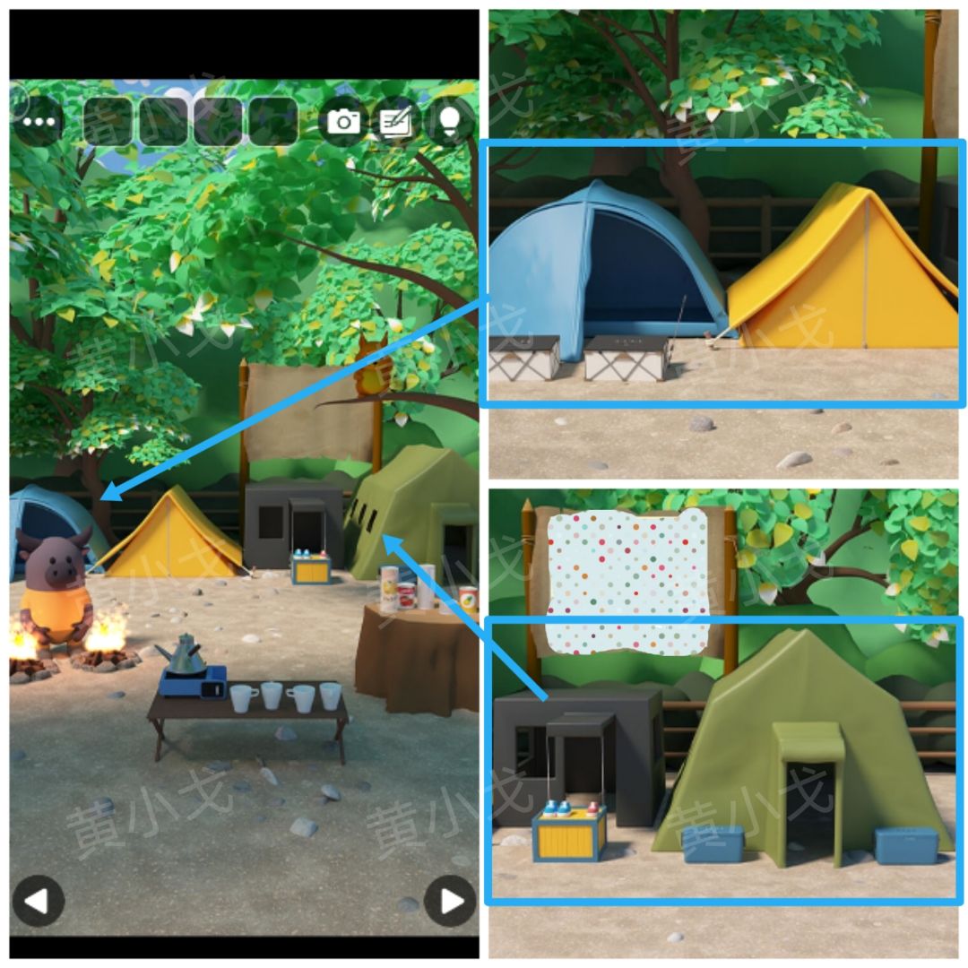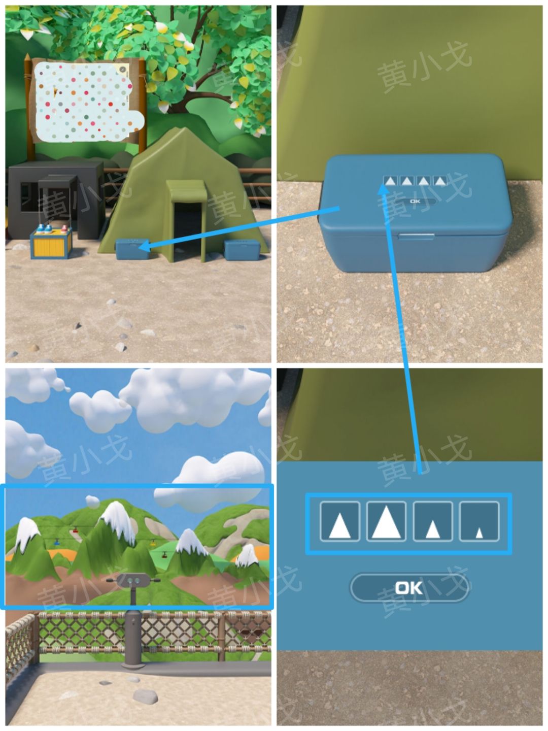 2.点击绿色帐篷前面的左侧箱子上的密码锁,根据[告示栏]场景山的大小,调整密码锁