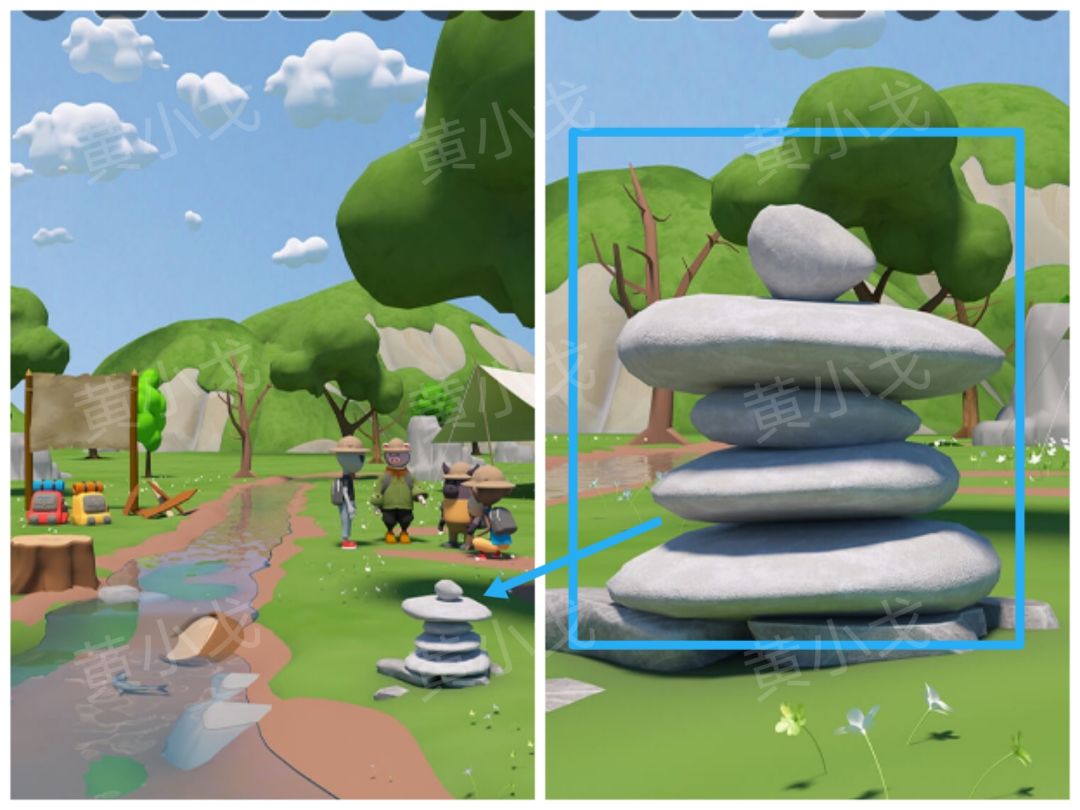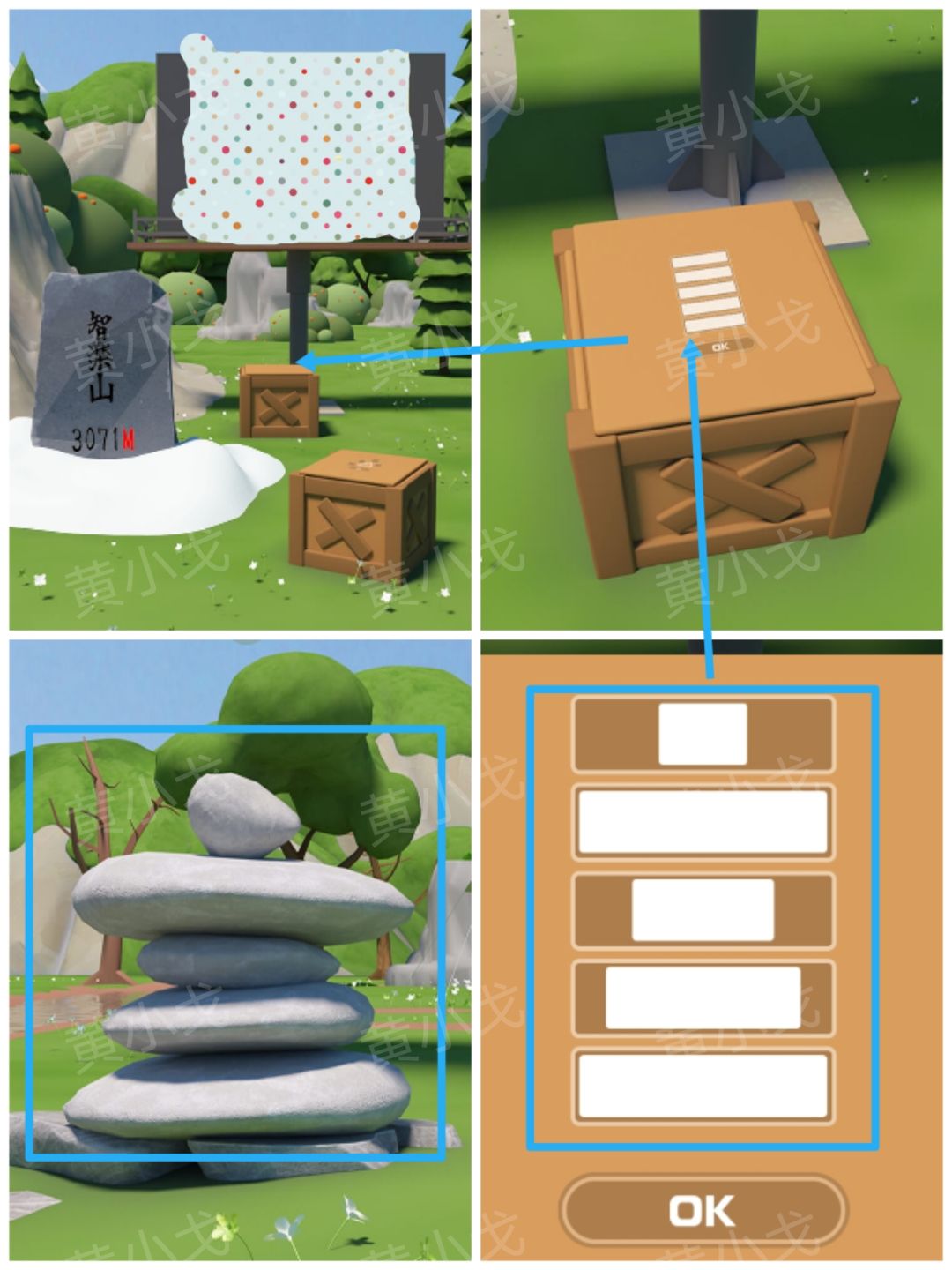 19.点击石碑右上方的箱子上的密码锁,根据[小溪]垒起来的石头大小线索,调整密码锁