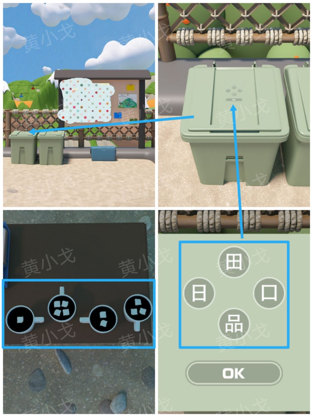 16.点击左侧垃圾桶上的密码锁,根据[帐篷]场景杯子把手朝向和里面的糖块数量线索,调整密码锁