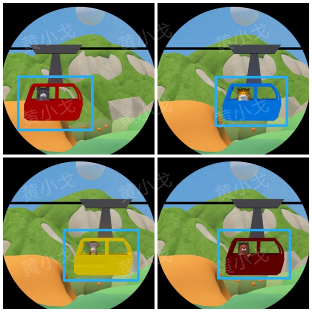 🔶缆车的颜色及里面的动物:红-猫🐱、蓝-老虎🐯、黄-猴子🐵、棕-狗熊🐻
