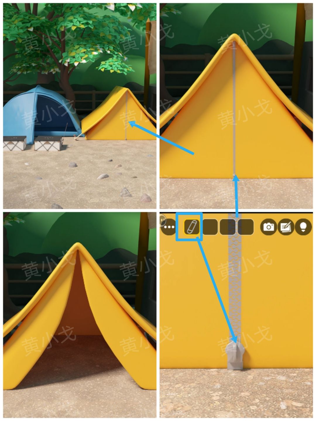 29.点击黄色帐篷的拉链,装上【拉链拉头】,打开帐篷