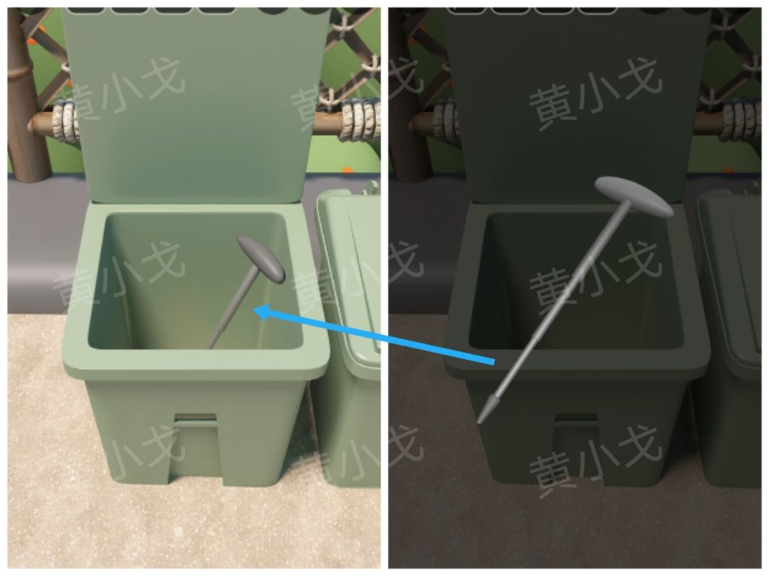 14.点击右侧垃圾桶上的密码锁,根据上面的颜色提示,结合线路图上的线索,调整密码锁