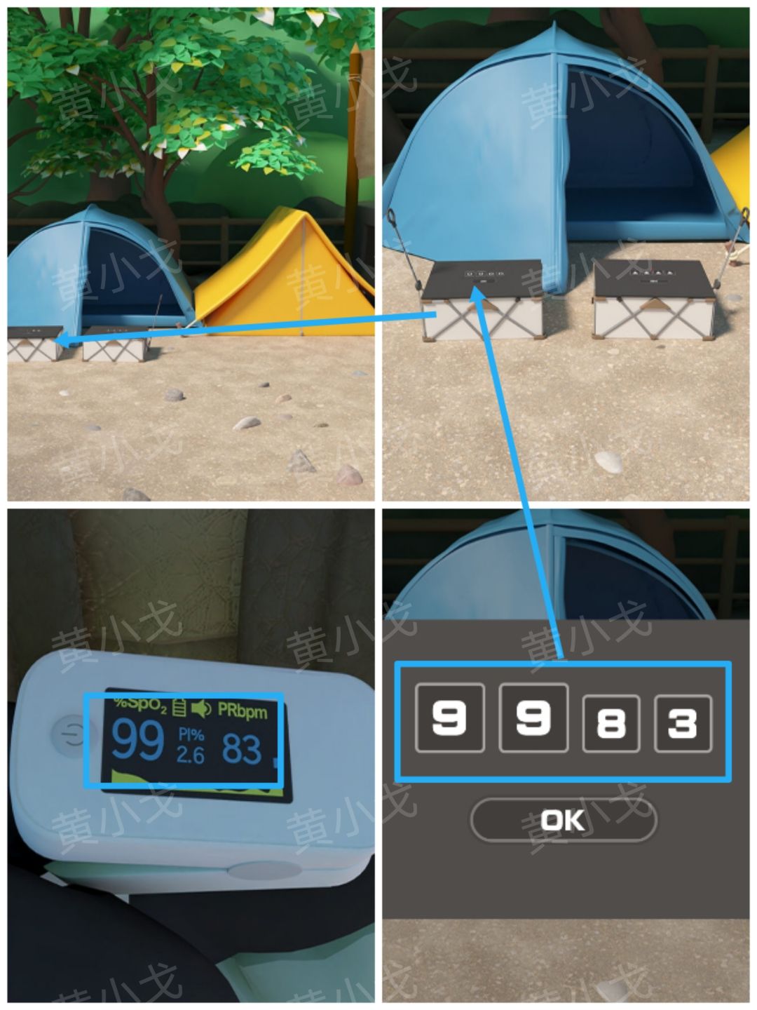 25.点击蓝色帐篷前面的左侧箱子上的密码锁,根据[告示栏]场景奶牛手上的仪器上的数值,输入密码:9983