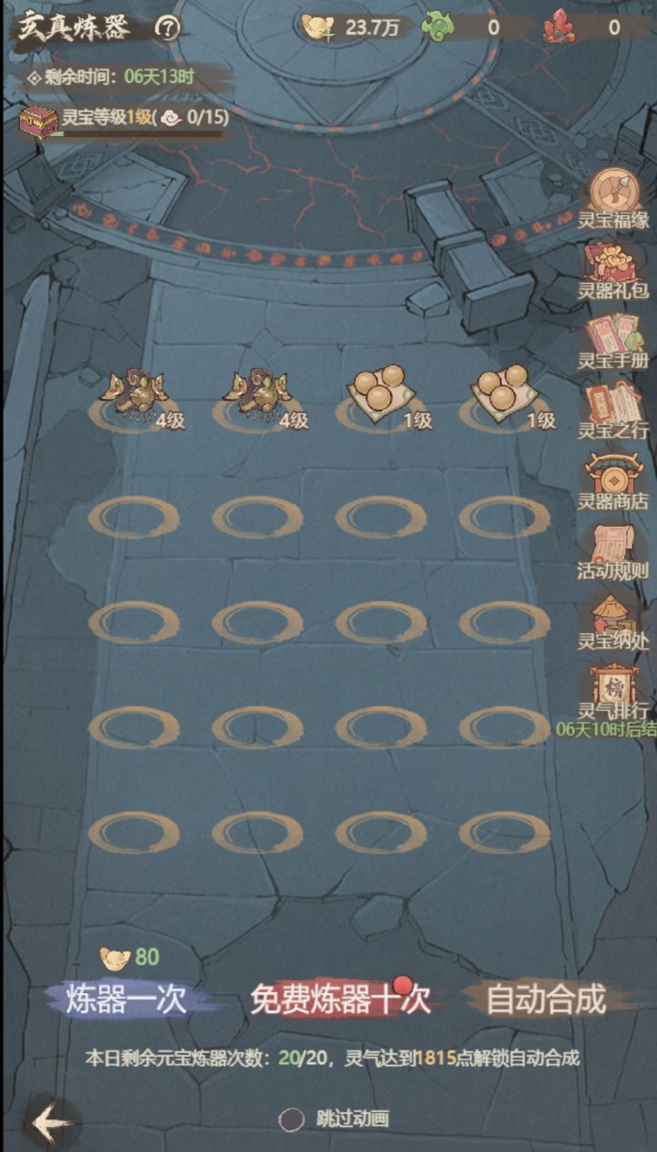 「玄真炼器」: 通过合成基础材料,获得积分/灵气,是兑换限定皮肤、特效、装扮的唯一获取途径!