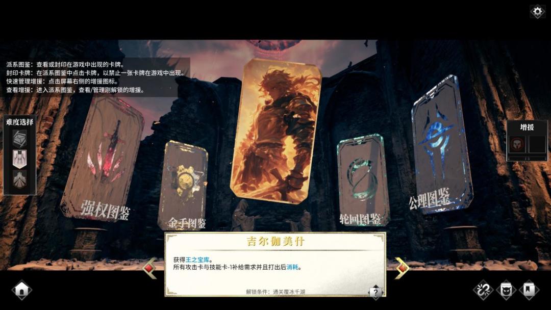 游戏有着相当庞大的卡池(500+张),9个难度等级(起始Buff不同)与10位可选英雄(前4位为默认解锁,后6位需要通过逐级通关游戏解锁),每位英雄都有着可以在某种程度上影响本局游戏卡牌构筑的不同的被动属性,玩家可以按照自己的打法习惯自由选择英雄并花费通过完成挑战取得的成就点数在图鉴中ban掉自己不需要的卡牌(可以稍微规避一下因卡池太大而导致的卡手风险),自由度很高,对于经常体验各类卡牌游戏的玩家来讲也比较容易上手,上手后打起来十分爽快。