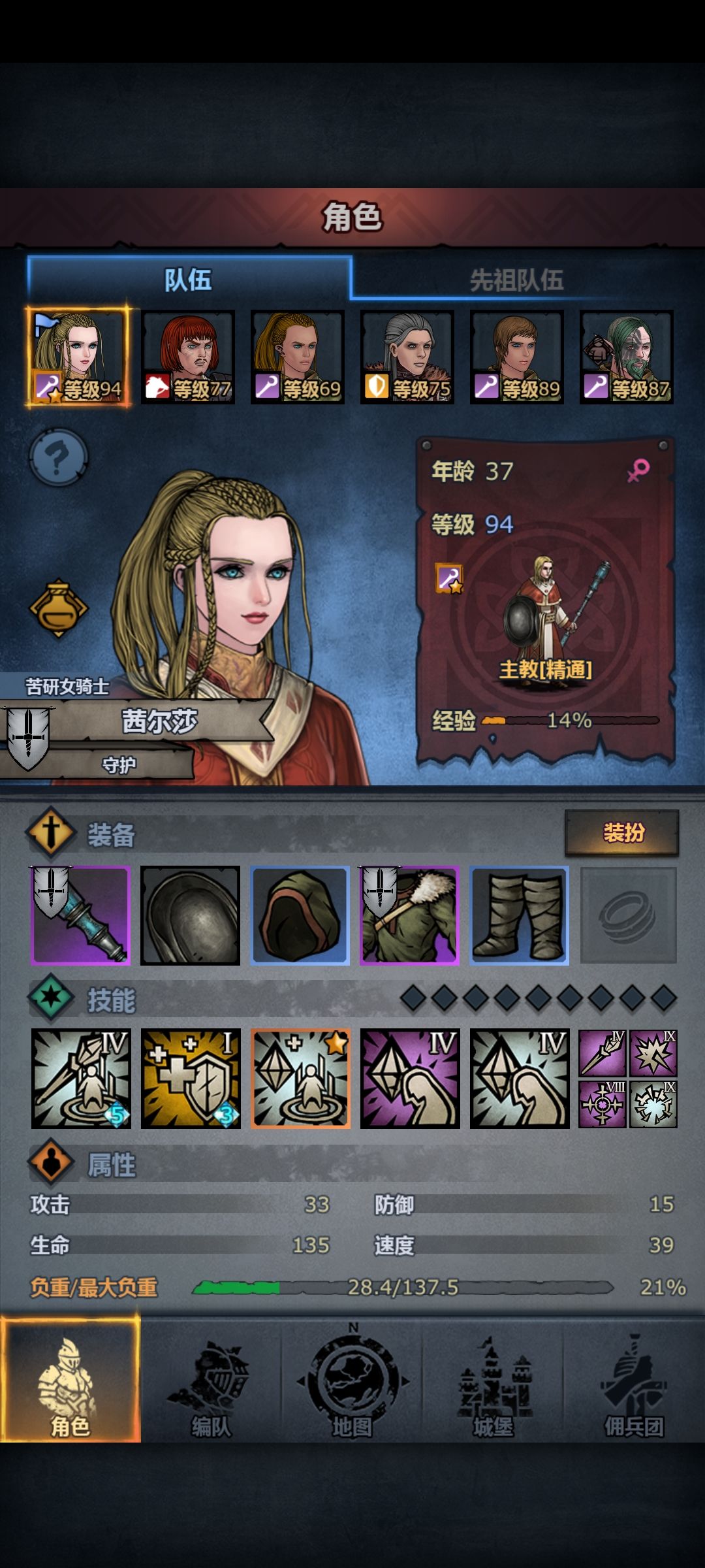 基司八盾都很吃力了,精通也得87级,遇到八盾长弓都很容易被移动秒,而且年龄也大。运气好酒馆找到更好的苗子可以把基思换掉。有氪金能力建议玛尔娜加基司
