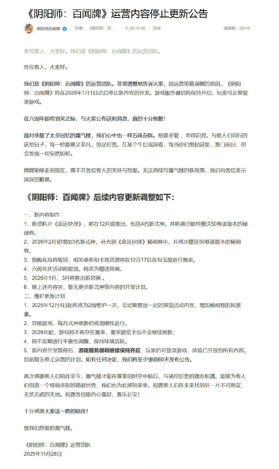 2026年起不做新内容了,但服务器一直开着,相当于给了大家一个永久的“牌局茶馆”,这点比直接关服暖太多。最后一个资料片《命运抉择》要送100张秘闻卷,相当于白给10个式神大礼包,策划是想让大家把喜欢的卡组都凑齐吧?