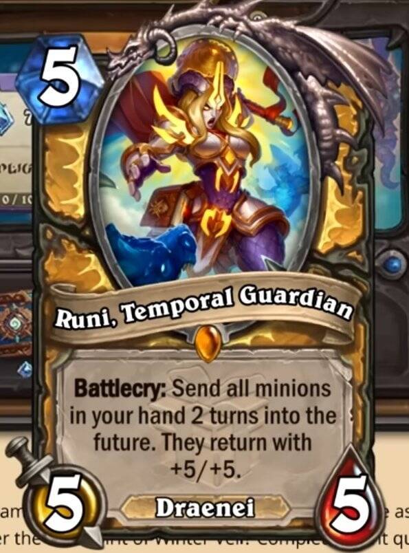 战吼: 将你手牌中的所有随从牌送入2回合后的未来。它们回来时拥有+5/+5