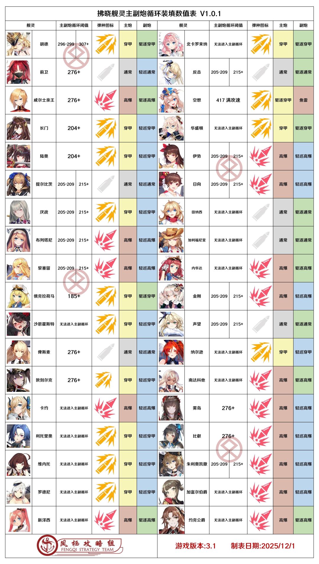 舰灵主副炮循环装填数值表