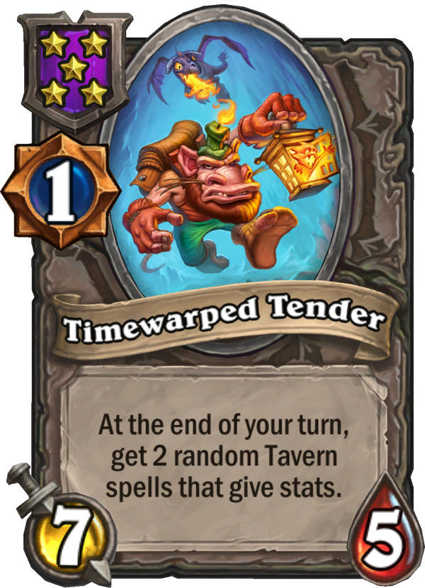 - [1费7/5] 在你的回合结束时,随机获取2张能使随从获得属性值的酒馆法术牌。