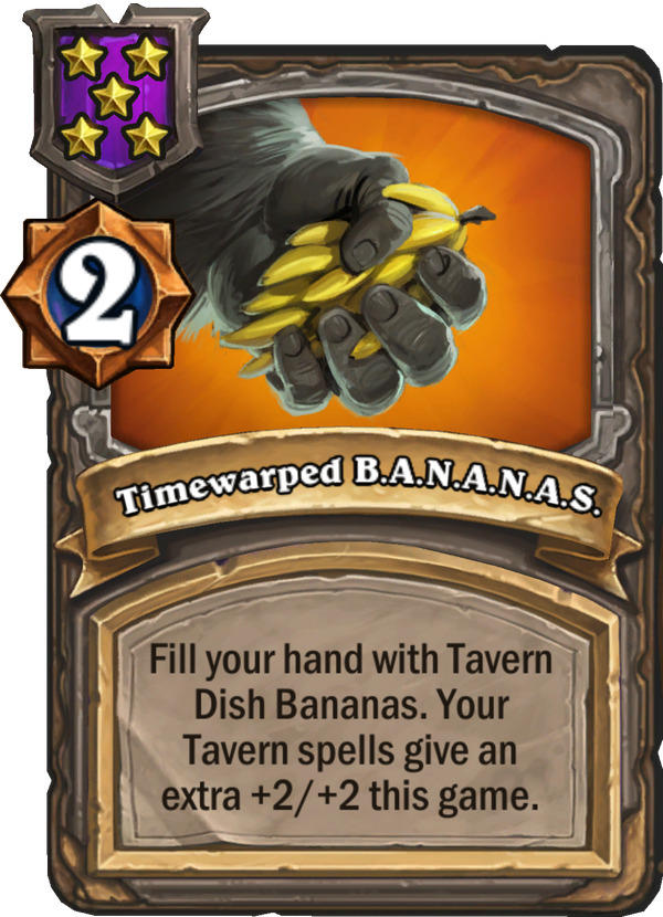 - [2费] 用香蕉果盘填满你的手牌。在本局对战中,你的酒馆法术使随从额外获得+2/+2。