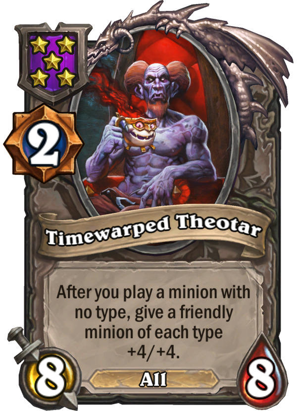 - [2费8/8全部] 在你使用没有类型的随从牌后,使每个类型的各一个友方随从获得+4/+4。