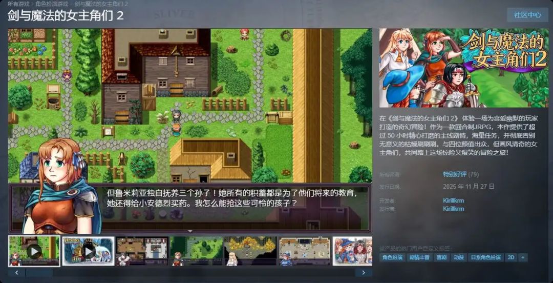 在某些老司机的固势思维中,几乎把RM和大量的动作情感游戏关联起来了。但事实证明RM制作工具绝非是此类游戏专属,实际上也可以正儿八经的做一个属于该领域的“3A”大作。在有了特别好评的前作的基础上,11月27日最新发售的《剑与魔法的女主角们2》可谓在各方面都做的更加的完善。玩家将控制战法牧道四个美少女组成的队伍(立绘还挺绅士),去庞大的世界中冒险,完成各种奇葩任务。战斗为经典的站桩回合制战斗,基于职业释放各种魔法和特殊技能。游戏的冒险氛围十分欢乐,文本量巨大且充满幽默。