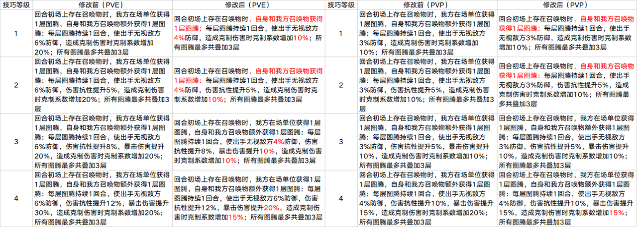 亲爱的小奥拉,经小奥拉反馈及对线上数据分析,我们发现技巧【召唤图腾】在低等级时提供的效果显著超出低级技巧提供增益的预期。出于对技巧效果整体增益和对后续战斗环境影响的考虑,我们在12月4日版本更新后将对技巧【召唤图腾】进行一定的调整。