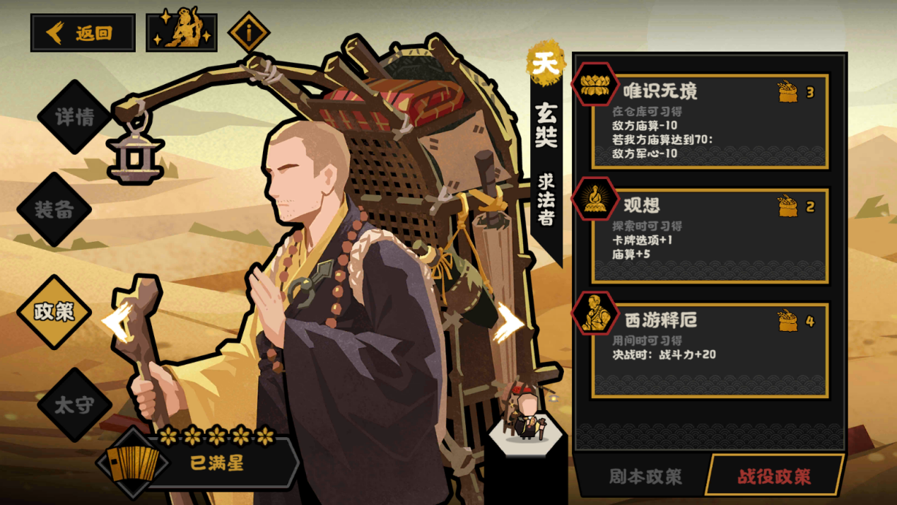 政策的缺点在于:施行需要1个经书,降低消耗为当前固定值,消耗低时发挥不理想,同时玄奘自身没有很好提高修行等级的手段。