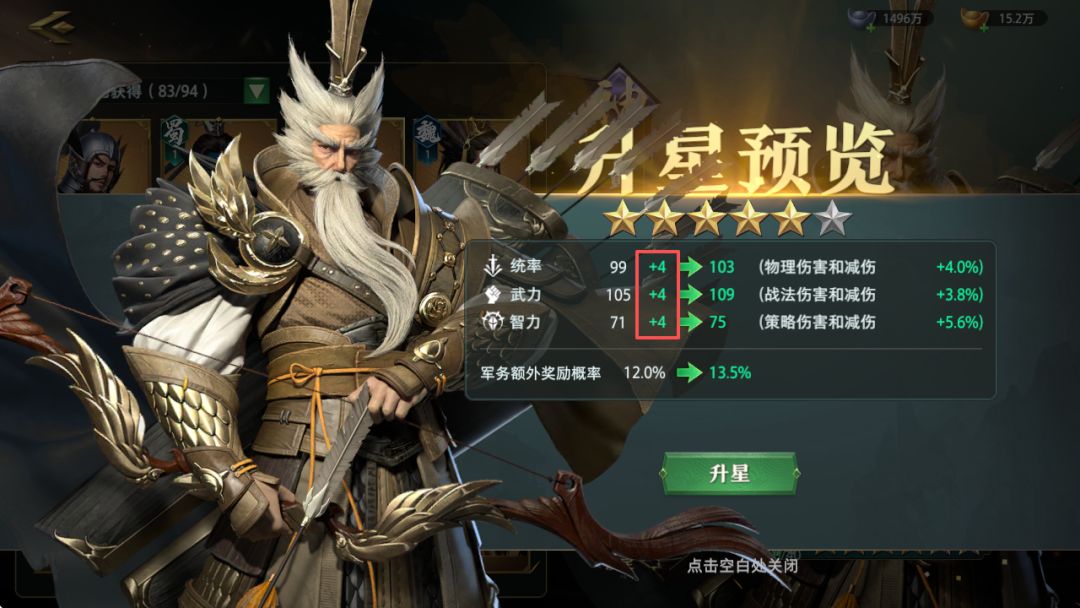聚贤馆招募武将保底次数从25抽调整为18抽后,武将获取难度大幅降低。为保证游戏平衡性,我们对武将升星和顿悟的消耗进行了小幅度上调。武将升星所能增加的三维属性按照消耗武将碎片/10来计算,相较于上个版本,这部分数值有所提升。具体调整如下: