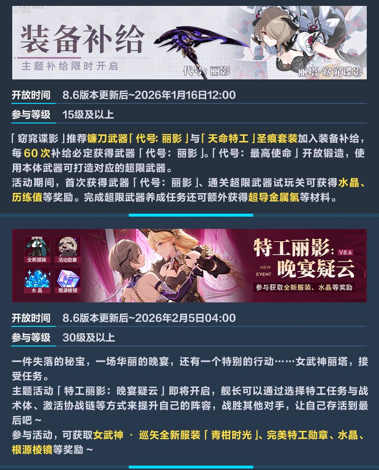 8.6版本「谜宴丽影」即将更新,全新S级角色「窈窕谍影」登场!参与本期该角色补给可享首次十连五折。