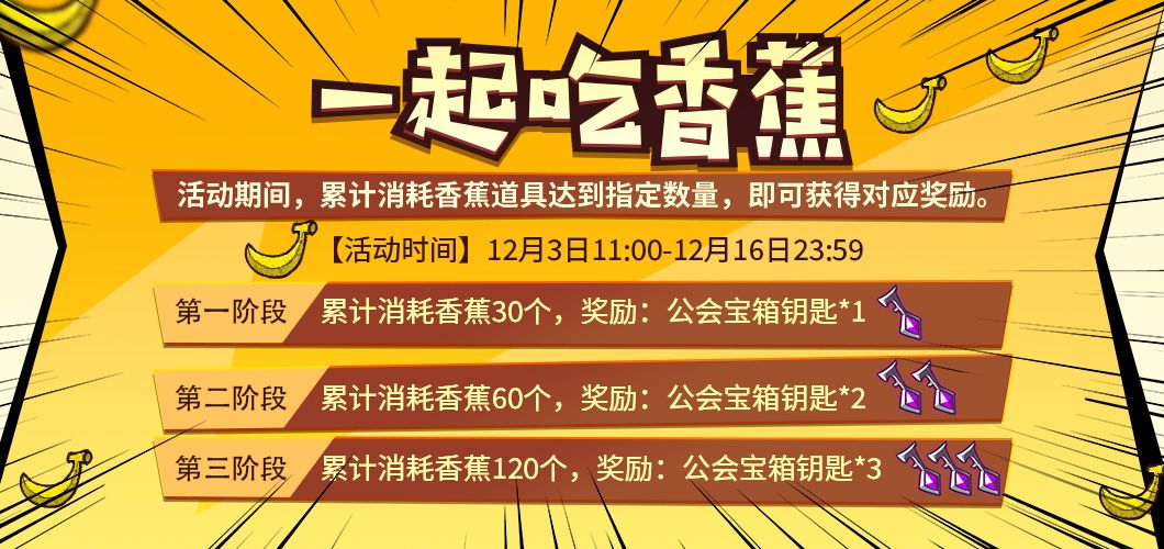 第三阶段:累计消耗香蕉120个,奖励:公会宝箱钥匙*3。