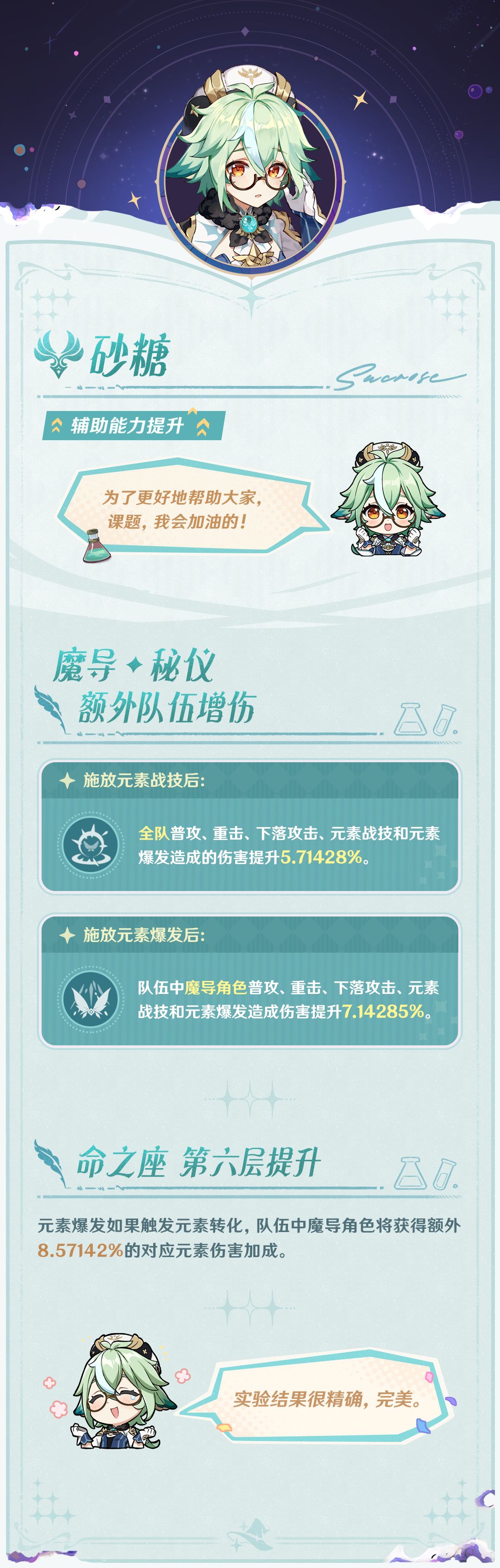 砂糖获得了一些小幅度的额外增伤能力,现在砂糖带莫娜或菲谢尔加入月感电队伍会有非常不错的提升顺带一提,砂糖的提升数值是一个神奇的数,1/7=0.142857,142857循环,142857被称为走马灯数,这组数乘1-6的结果仍然由这六个数组成,并且扔按照142857的顺序排列