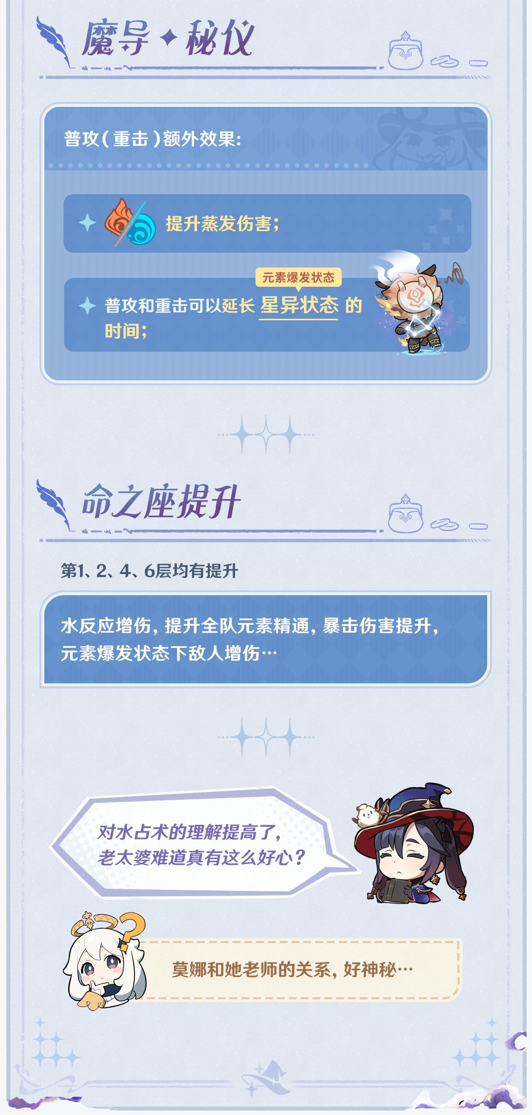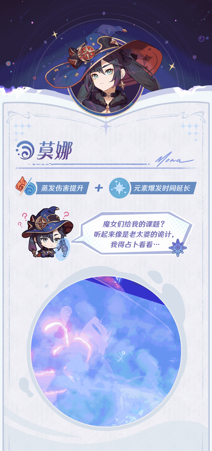 莫娜获得了额外的蒸发反应增伤,并且重击可以延长大招对怪物的异常状态,命座中的水反应增伤也获得加强,在以后的水反应体系里应该都会有比较不错的表现