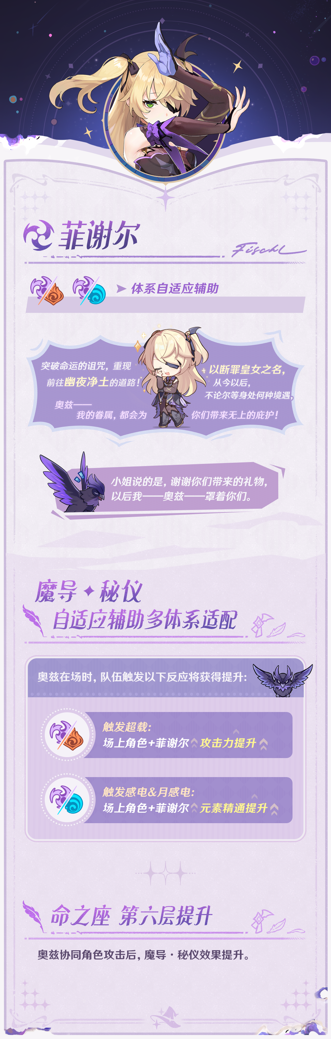 皇女获得了针对不同体系的额外拐力,根据不同队伍获得对自己和前台角色的属性加成,超载队伍中获得攻击力提升,感电队伍中获得元素精通提升
