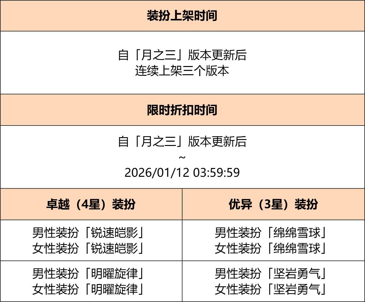● 「月之三」版本更新后,共计4套卓越(4星)装扮、4套优异(3星)装扮限时上架千星商城,在上架期间均限购1次。