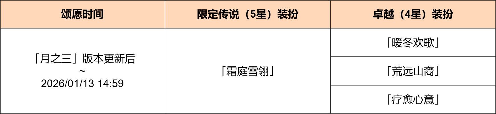 ● 「月之三」版本更新后,新增卓越(4星)套装形录「橙叶苍藤」进入「奇遇回声」常驻颂愿中。