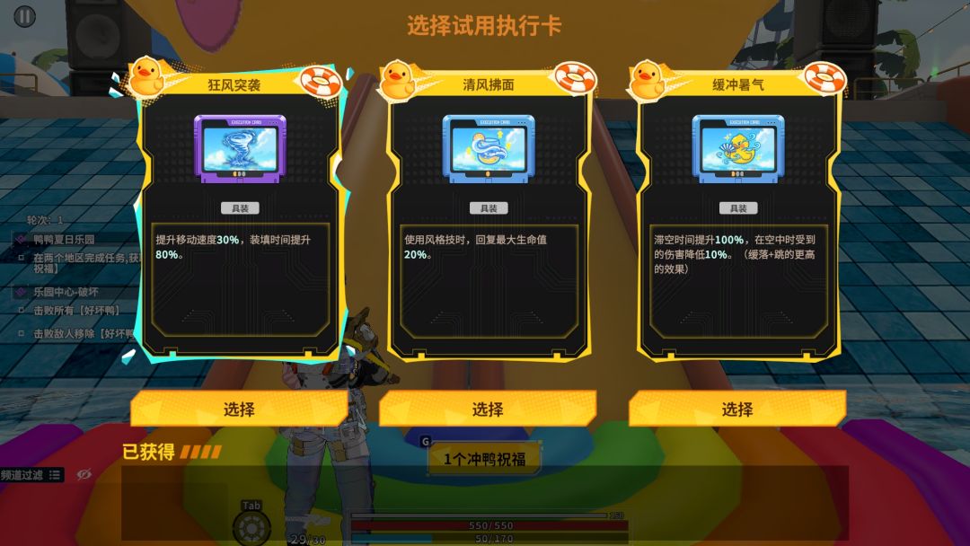 每轮关卡开始时,小黄鸭将为所有人派发冲鸭祝福,可以为战斗员和武器提供各种战力加成,让我们火力全开,直面强敌。