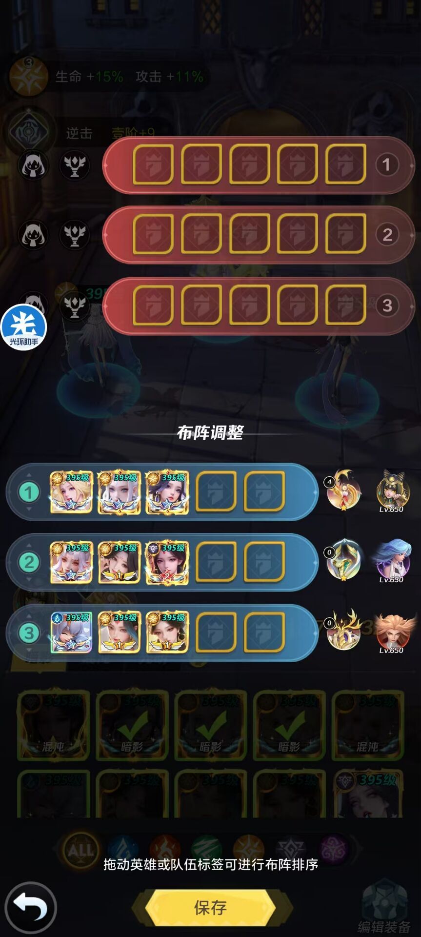 3逆击队:11神5貂蝉+11神5龙母+神5莫邪(还是根据个人实际情况增补神兵或者复苏即可)