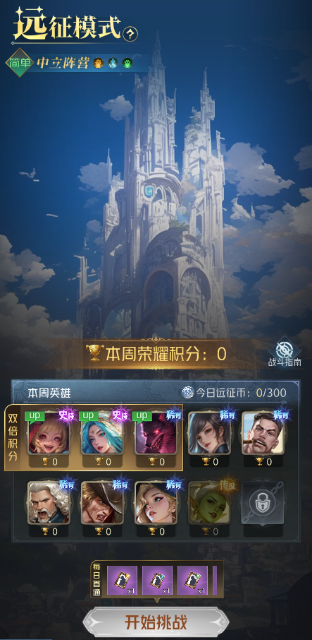 每周首次进入对应阵营关卡时,系统将随机分配9名已拥有的永久英雄,每个阵营的分配英雄各自独立。同时还可使用自选史诗远征券和自选高级远征券,自选已拥有的史诗/传说英雄进行挑战。