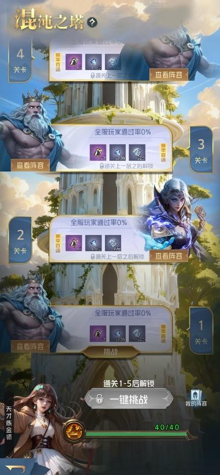 「混沌之塔」中的挑战阵容为远征模式最后一关准备阶段结束时的阵容,在挑战过程中无法更改阵容或使用英雄技能。